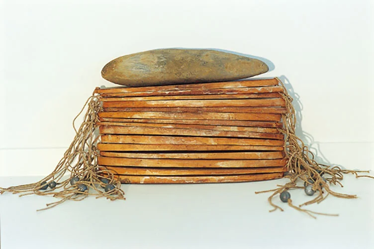 Materials: Salvaged kauri, found stone, lead sinkers, string and acrylic paint.