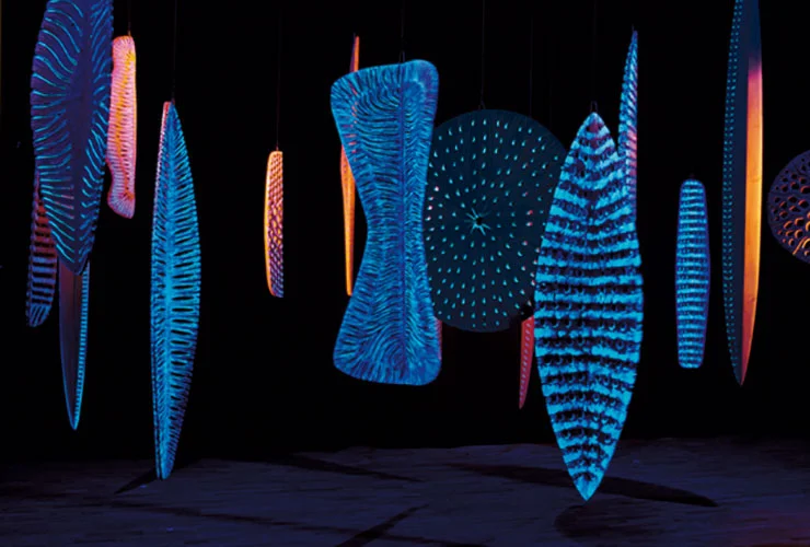 The works were exhibited in ultraviolet light with a video component that included layered Antarctic footage with dissolved, coloured and animated Electron Microscope images. The suspended sculptures were also highlighted with luminescent paint.