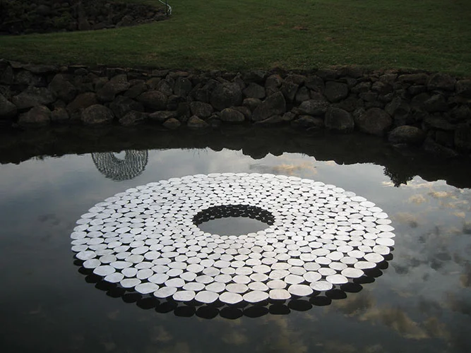The Horizontal Disk: A 'shadow' form was created from the 'drop-outs' of the Vertical disk; a complex assemblage of randomly patterned steel 'stones'. The horizontal form appears to 'float' above the pond surface. From certain vantage points, the work becomes an optical game. The vertical disk is reflected in the same pool as the Horizontal disk - its negative "reflection".