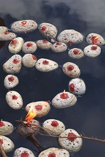 Each drilled bead is hollowed out, connected with wire, filled with red wax and a wick. Unpredictably the surplus wax built up and set fire to the floor of the Manawatu Art Gallery, Palmerston North.
