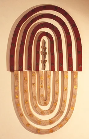 The sculpture was cut from a single slab of salvaged kauri, with small, gold-leaf squares on the lower arcs and equal squares of lead on the upper arcs. The red pigment suggests life, and waxen white signifies death.